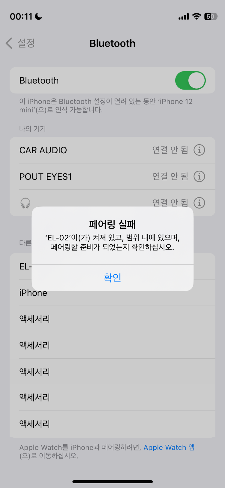 아이폰의 경우, iOS 버그로 인해 블루투스 기기 연결이 일시적으로 안 되는 경우가 있어요.