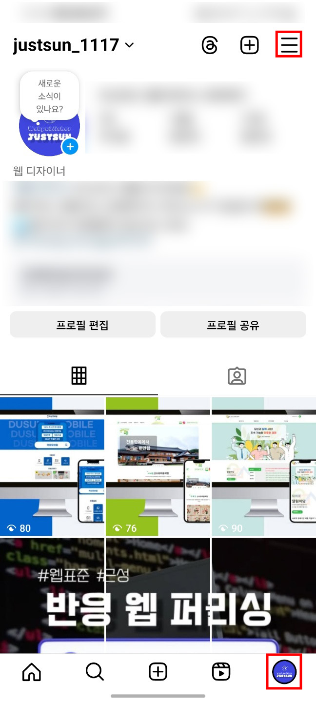 - 프로필 탭 → 오른쪽 상단 메뉴(☰) 클릭